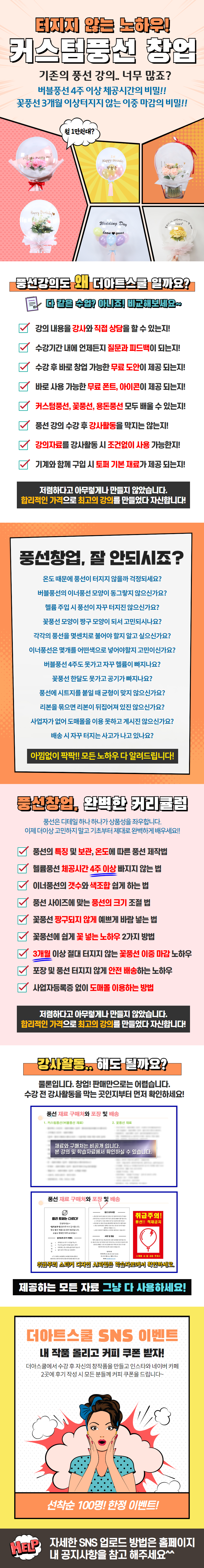※ 풍선 강의는 창업 강의로 풍선 창업에 대한 모든 노하우가 포함되어 있으므로 1강 수강 후 강의가 마음에 안드신다면 바로 환불 신청 해주시기 바랍니다. 2강 이상 수강 시 절대 변경, 취소, 환불이 불가 합니다.