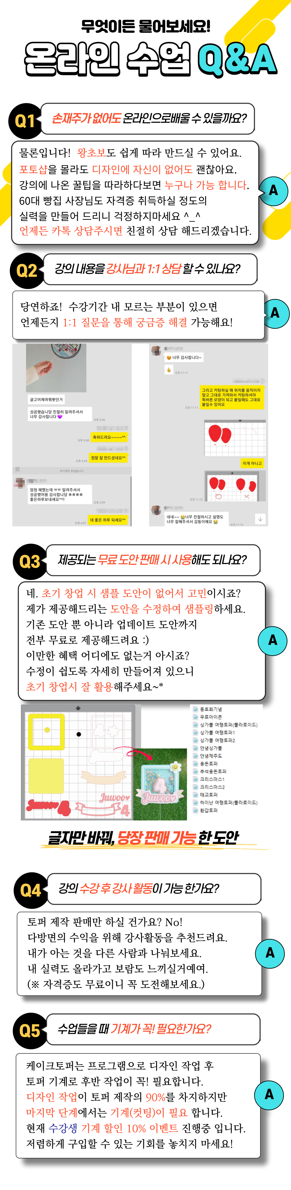 ※ 수강 중 질문의 강의 관련된 질문에 한해 수강중에만 하실 수 있으며, 작품에 대한 피드백은 드리지 않습니다.