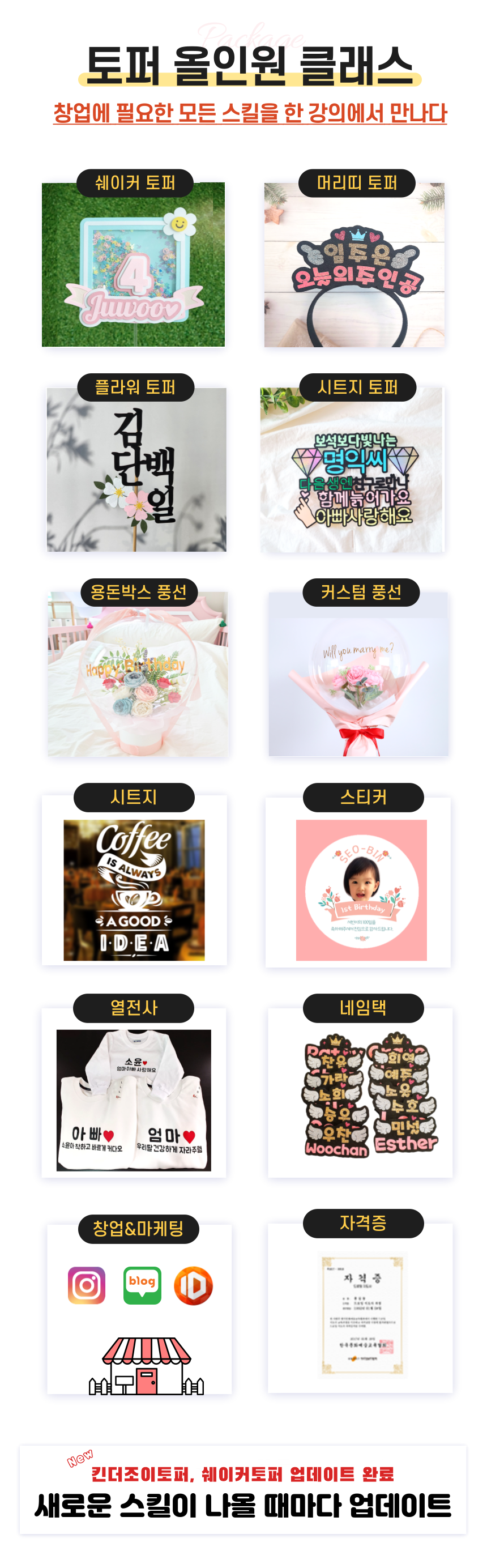 ※ 토퍼 강의는 창업 강의로 토퍼 창업에 대한 모든 노하우가 포함되어 있으며 시트지, 네임택, 풍선 및 창업, SNS 강의를 무료로 제공하고 있습니다.